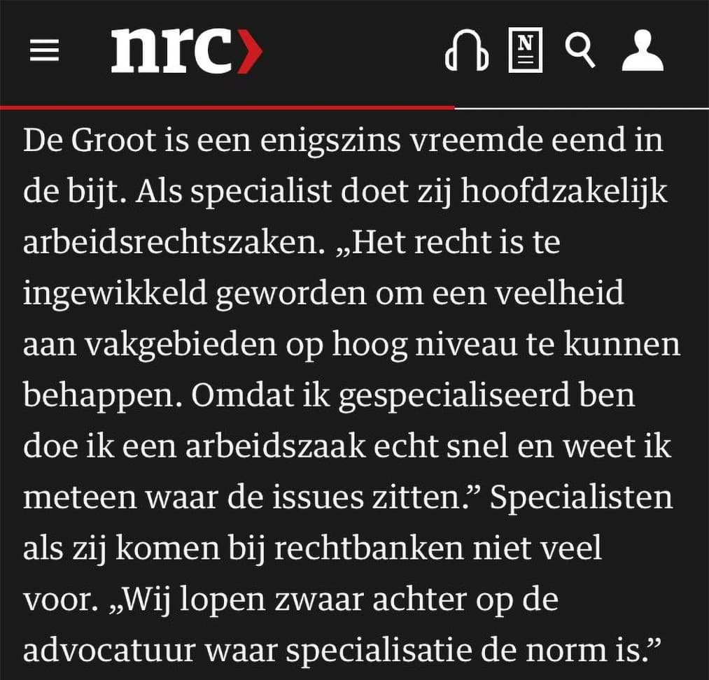 Ik vind dit vreemd, de voorzitter propageert dus juist de rechters variant van de generalistische brekebeen. In mijn opinie is het absoluut onmogelijk om van elk rechtsgebied verstand te hebben, en een rechter zal dus juist langer moeten werken aan een zaak om zich te materie eigen te maken, wat de werkdruk juist verhoogt. Ik ben specialist op het gebied van het bestuurs- ben omgevingsrecht en ik wil het niemand aandoen dat ik een zaak strafzaak of arbeidsrechtgeschil behandel. Hierbij een screenshot (ivm betaalmuur) van het artikel: