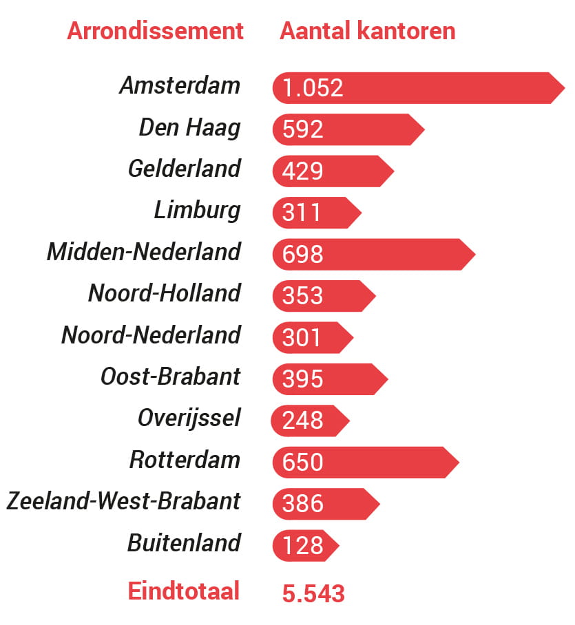 - Op 1 januari 2024 telde Nederland 5.543 advocatenkantoren. Amsterdam is met 1.052 kantoren en 6.452 advocaten veruit het grootste arrondissement, gevolgd door Midden-Nederland (698 kantoren) en Rotterdam (650 kantoren). Overijssel is met 248 kantoren en 649 advocaten het kleinste arrondissement.