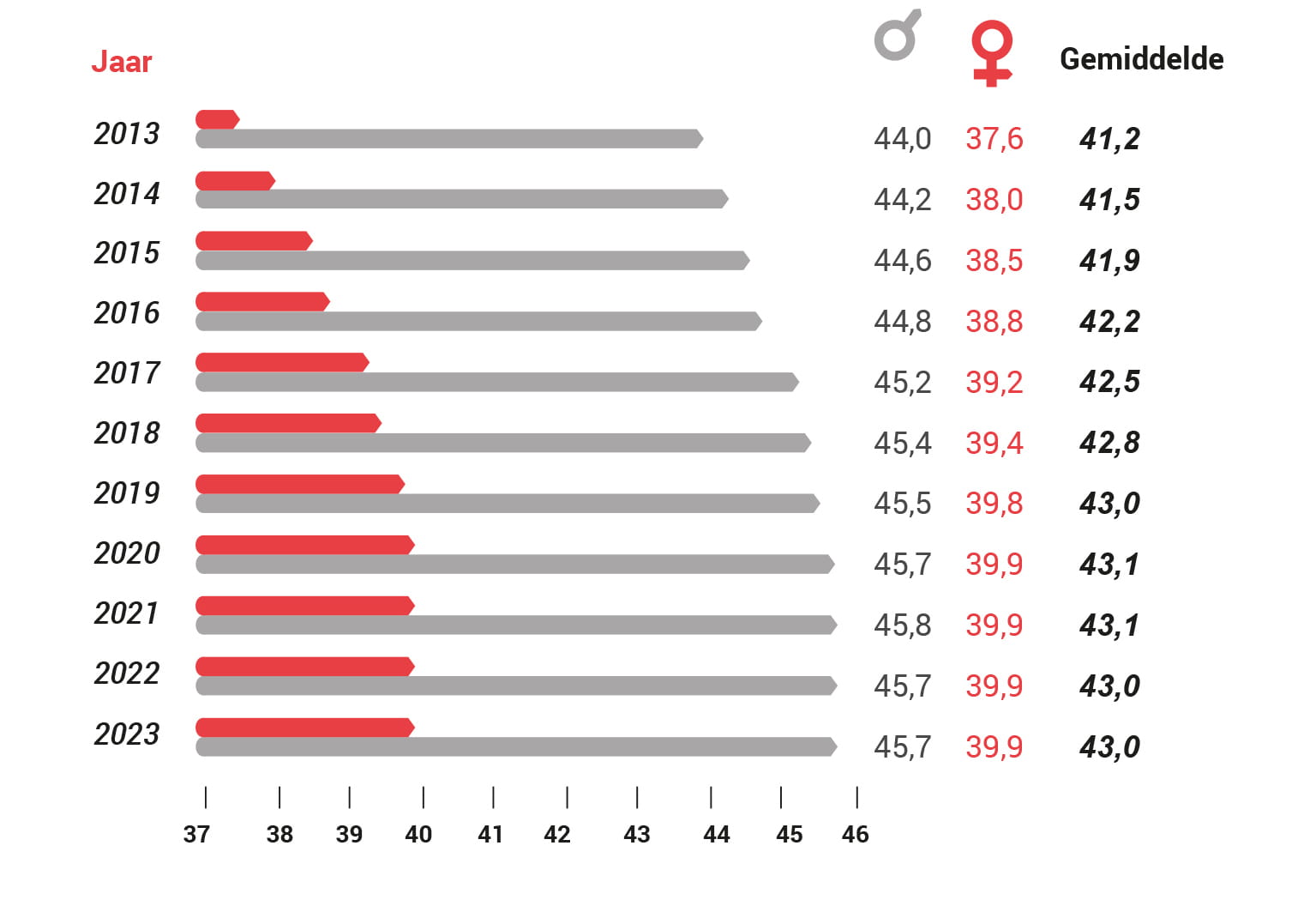- De gemiddelde leeftijd van advocaten is gelijk gebleven: 43 jaar. Het arrondissement Amsterdam kent gemiddeld de jongste advocaten: 39,6 jaar, Noord-Nederland de oudste: 46,4 jaar.