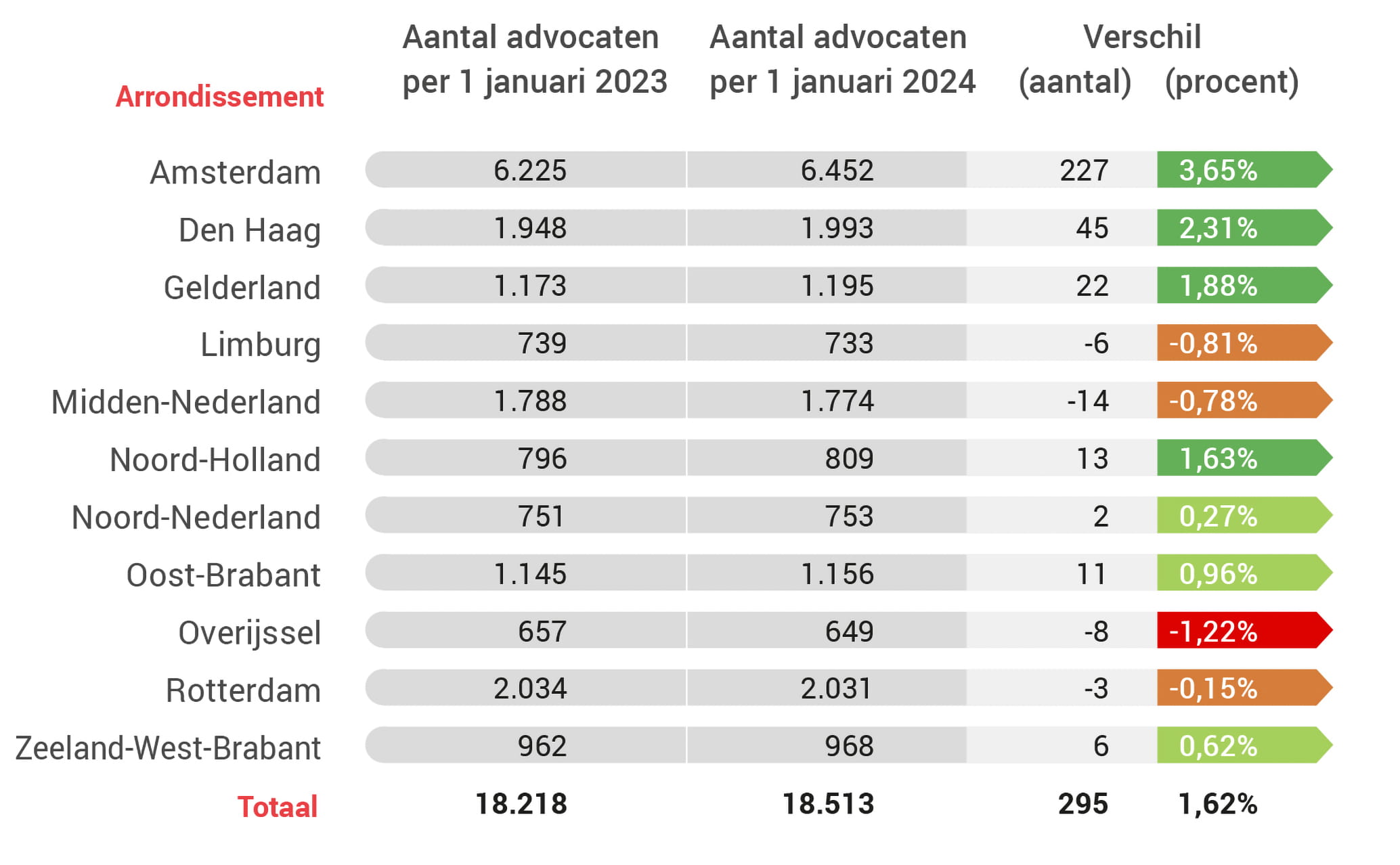 - In 7 van de 11 arrondissementen groeide het aantal advocaten, in 4 arrondissementen was sprake van een lichte afname. In Amsterdam kwamen er de meeste advocaten bij (+227), gevolgd door Den Haag (+45) en Gelderland (+22). De grootste relatieve daling van het aantal advocaten was in Overijssel (-1,2%). De grootste absolute daling kwam op conto van Midden-Nederland (-14).