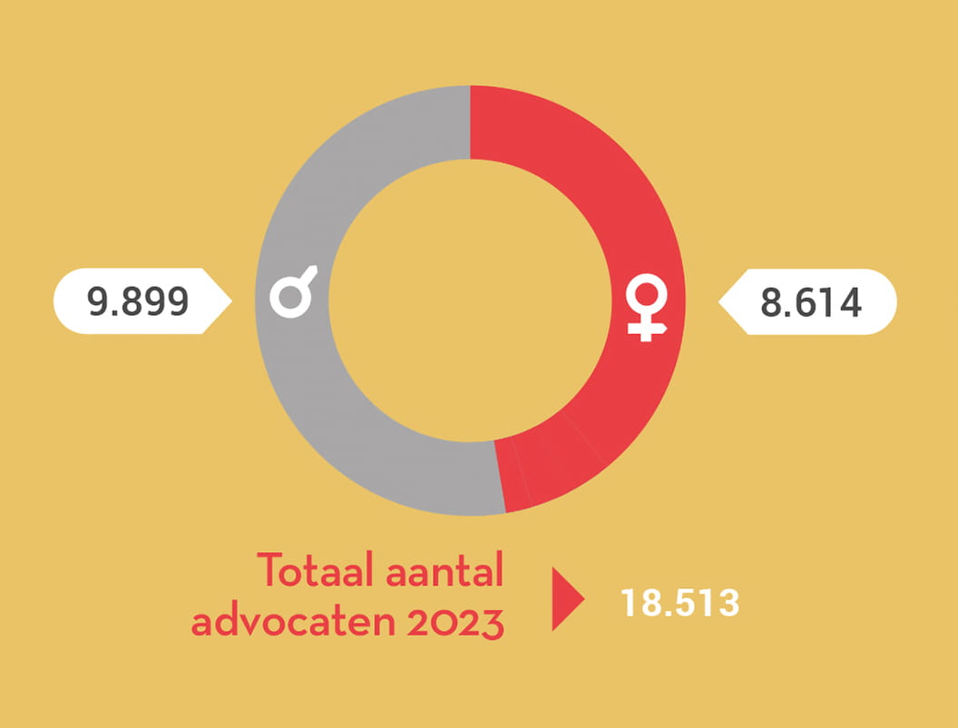 - Het aandeel vrouwelijke advocaten nam licht toe tot 46,5% (8.614 vrouw, 9.899 man). Tot en met 39 jaar zijn er meer vrouwelijke dan mannelijke advocaten, daarboven andersom. In één arrondissement werken voor het eerst meer vrouwen (50,2%) dan mannen: Midden-Nederland.