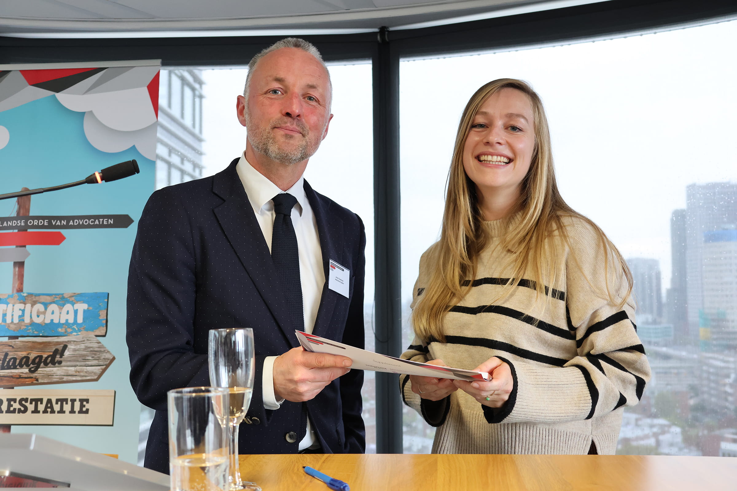 Op 25 april kwamen ruim 200 advocaat-stagiairs en patroons naar de NOvA voor de feestelijke certificaatuitreiking van de Beroepsopleiding Advocaten. Yvonne Zoetbrood mocht (symbolisch) als eerste het certificaat in ontvangst nemen uit handen van NOvA-bestuurder Jeroen Soeteman. Meer foto’s? Bekijk ze hier.