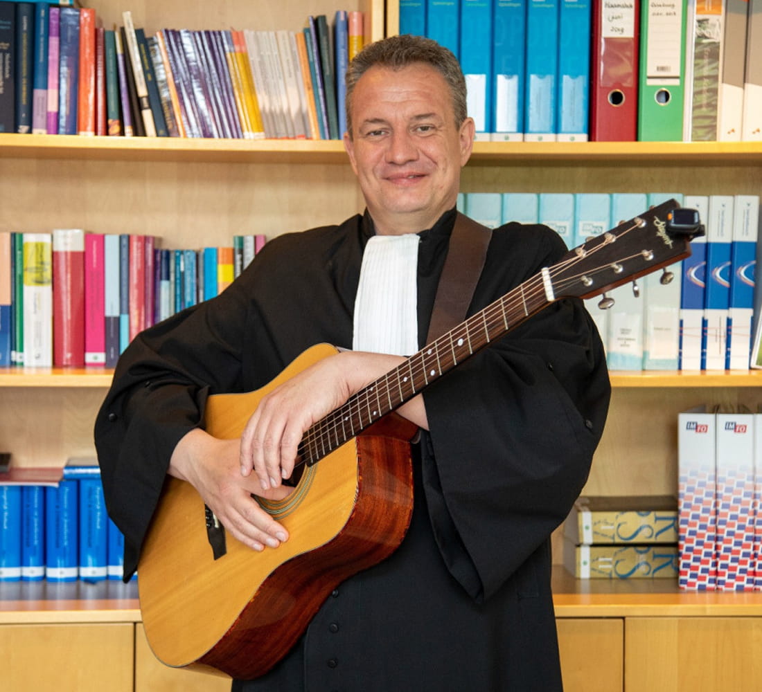Ook Maarten Russchen (1964) is er uiteindelijk in geslaagd de muziek en de advocatuur professioneel te combineren. Hij studeerde aan het conservatorium, werkte als sessiegitarist en invaller bij het Metropool Orkest, maar ging rechten studeren om meer zekerheid te hebben. ‘Als advocaat krijg je de praktijk die je toekomt, dus zo werk ik al jarenlang voor cliënten in de muziekindustrie. Meestal aan de kant van de producent, maar tegenwoordig ook geregeld voor artiesten’. Met compagnon en begenadigd violist Raimond Dufour heeft hij zijn eigen kantoor Coda Advocaten in Amersfoort. Dufour speelt in diverse orkesten en ook Russchen treedt veel op. ‘Het is gewoon leuk om te spelen en altijd erg gezellig met de collega-muzikanten. Alleen in de dossiers zitten is niet voldoende voor mij.’