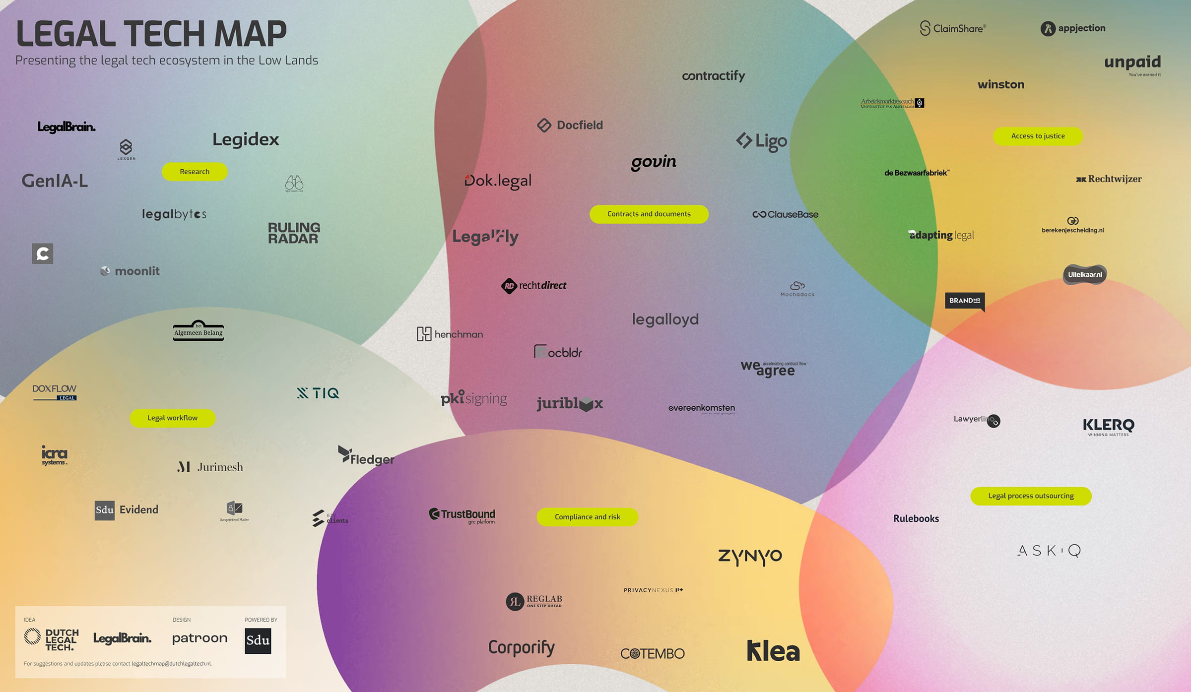 ‘De bedrijven hebben zich zelf bij ons gemeld,’ vertelt Jelle van Veenen van brancheorganisatie Dutch Legal Tech. ‘We signaleren een flinke groei sinds de eerste Legal Tech Map uit 2018. Het aantal start-ups gaat omhoog en het kwaliteitsniveau stijgt. Ook financieel gaat het de sector voor de wind, met geslaagde financieringsrondes en interessante exits en overnames.’ [www.legaltechmap.nl]