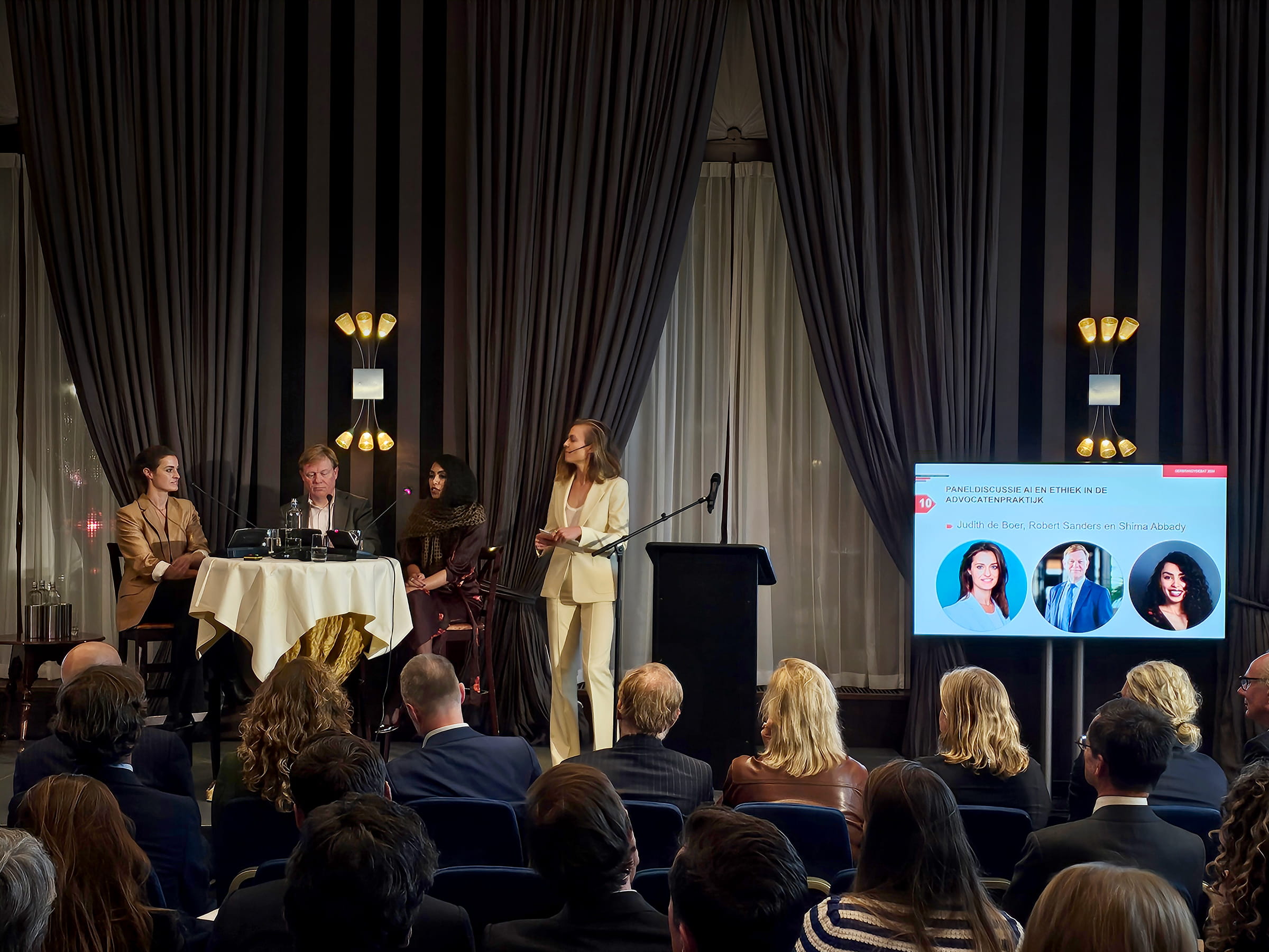 Tijdens het Gerbrandydebat op 6 november in Den Haag gingen advocaten Judith de Boer (Hertoghs), Robert Sanders (De Clercq) en Shima Abbady (Bird & Bird) met elkaar en de zaal in gesprek over AI en ethiek in de advocatenpraktijk. Over de vraag of AI advocaten in de toekomst (deels) gaat vervangen, waren de meningen verdeeld, maar zeker is dat advocaten niet kunnen ontkomen aan het werken met AI. Omarm het, luidde het devies. Voorafgaand waren de ruim honderdvijftig aanwezigen al geïnspireerd door presentaties van techniekfilosoof Wietse Hage en Joris Krijger, Ethics & AI Officer van de Volksbank.