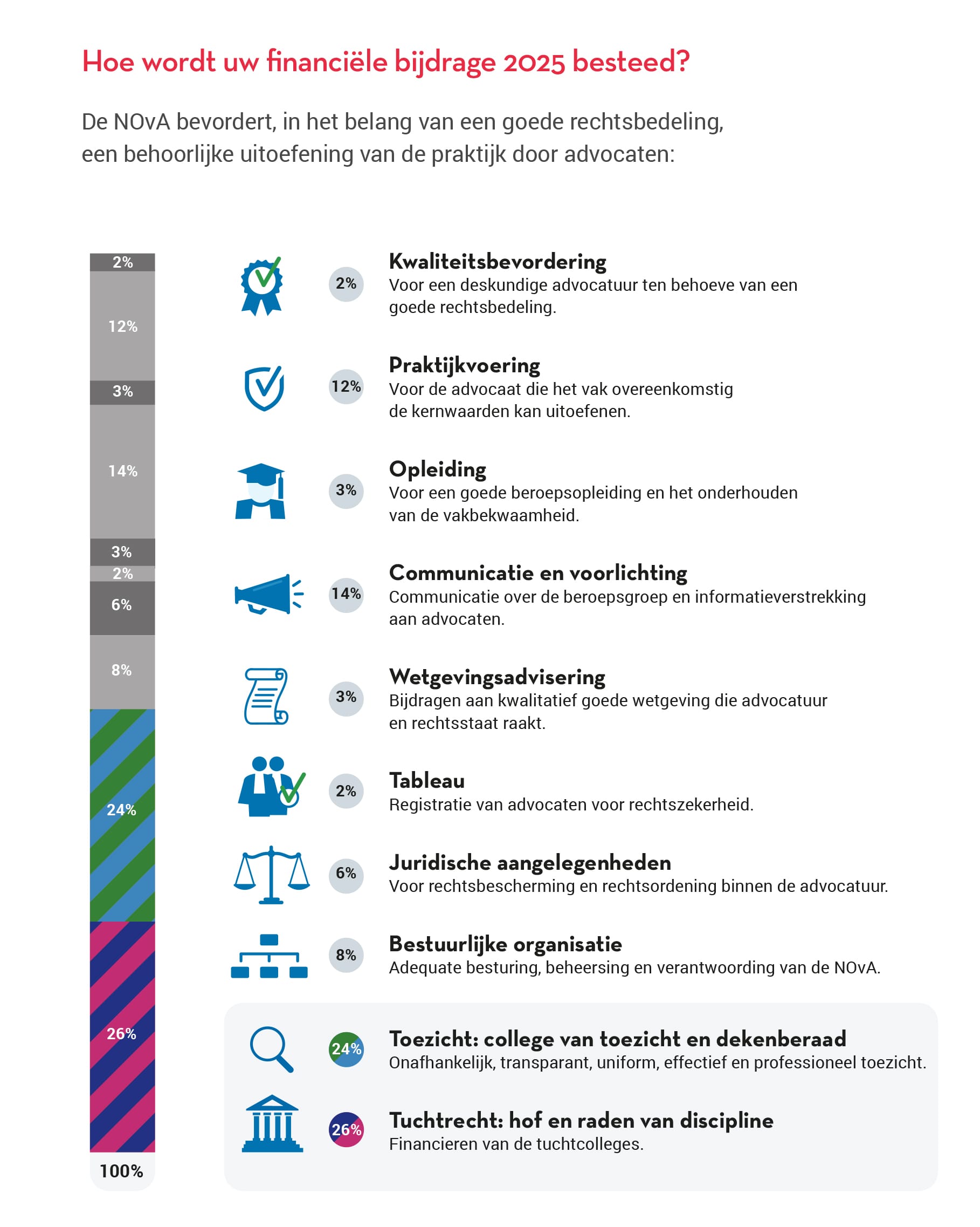 De financiële bijdrage stelt de Nederlandse orde van advocaten in staat om haar wettelijke taken uit te voeren. Van de financiële bijdrage aan de NOvA gaat in 2025 het grootste deel (26%) naar de bekostiging van de tuchtrechtspraak (Hof en Raden van Discipline). Vlak daarna (24%) volgt het toezicht op de advocatuur, opgebouwd uit de kosten van het college van toezicht en het dekenberaad. De andere helft gaat naar de uitvoering van de overige wettelijke taken van de NOvA.