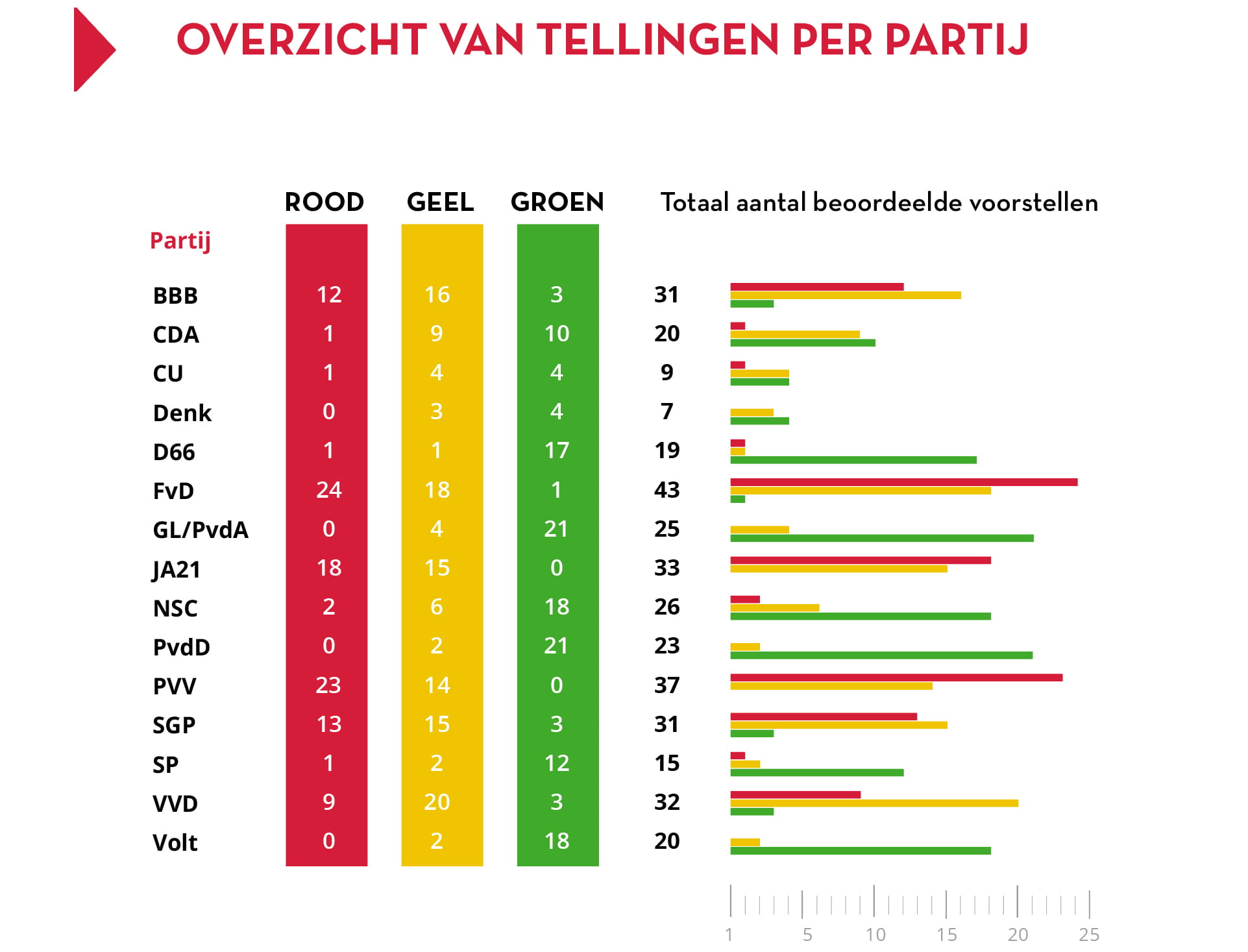 De toetsingen van de programma’s voor de Tweede Kamerverkiezingen vertonen sinds 2012 een zorgwekkende ontwikkeling. Een toenemend aantal programma’s bevat voorstellen die strijdig zijn met beginselen van rechtsstatelijkheid. Bij de verkiezingen van 2012 ging dit om slechts twee van de getoetste programma’s, in 2017 kregen voorstellen in vijf van dertien getoetste programma’s rode kwalificaties. In de toets verkiezingsprogramma’s 2021 betrof het inmiddels de helft (zeven van de veertien getoetste programma’s) en in 2023 kregen tien van de achttien getoetste programma’s rode kwalificaties. In de toets van 2025 bevatten twaalf van de vijftien getoetste programma’s ten minste één met de rechtsstaat strijdig voorstel en in bijna twee derde van de programma’s is er sprake van meerdere met rood gekwalificeerde voorstellen.