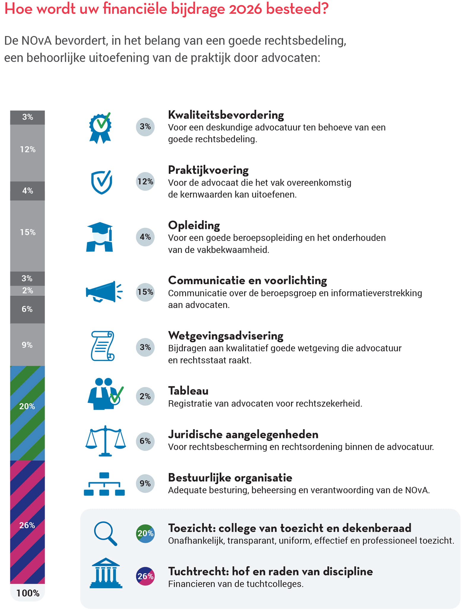De financiële bijdrage van advocaten stelt de NOvA in staat om haar wettelijke taken als publiekrechtelijke beroepsorganisatie uit te voeren. Van de financiële bijdrage gaat in 2026 het grootste deel (26%) naar de bekostiging van de tuchtrechtspraak (Hof en Raden van Discipline). Met 20% volgt het toezicht op de advocatuur, opgebouwd uit de kosten van het college van toezicht en het dekenberaad. Iets meer dan de helft (54%) gaat naar de uitvoering van de overige wettelijke taken van de NOvA.